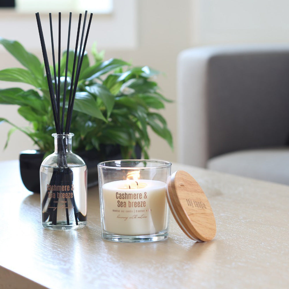 Difusor de palheta com aroma de Caxemira/ Brisa Mar, com design simples, moderno e uma fragrância única. Pode combinar este ambientador com a vela perfumada da mesma coleção e dar um toque de requinte ao seu espaço.