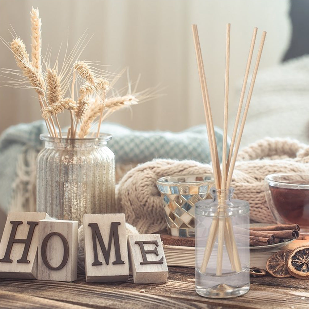 Difusor aromático em frasco de vidro com composição de uma fragrância de frutas. Uma fragrância universal e intemporal criada especialmente para aromatizar o ambiente de uma forma leve e sedosa.