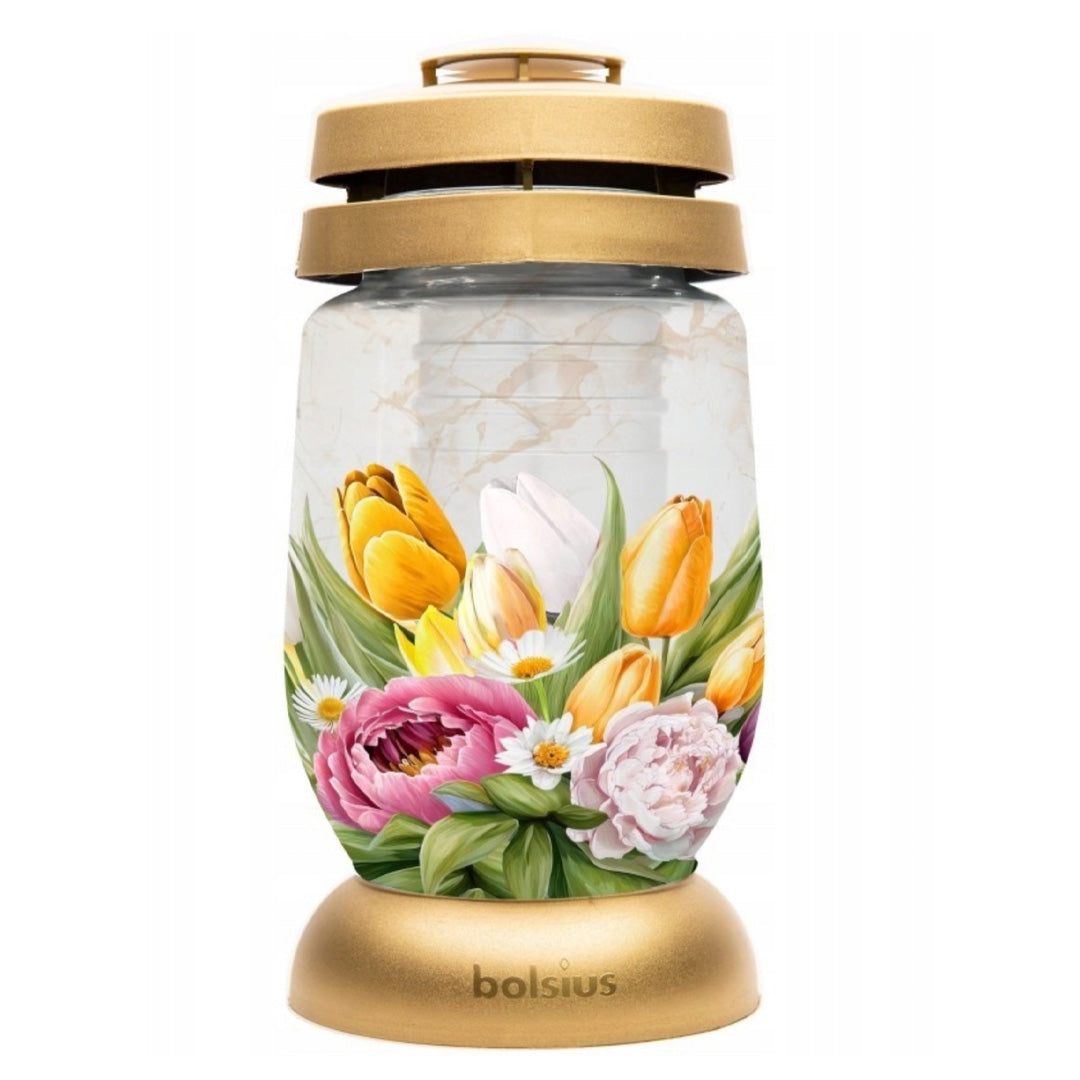Candeeiro religioso de vidro. Tampa anti-vento e base em plástico. Com motivo Primavera, ideal para colocação em cemitério (Jazigo ou Campa). Ofereça luz a quem já partiu, mantendo viva a memória no seu coração. Para iluminação do candeeiro recomendamos a utilização das nossas Recargas 0140 ou RP3.