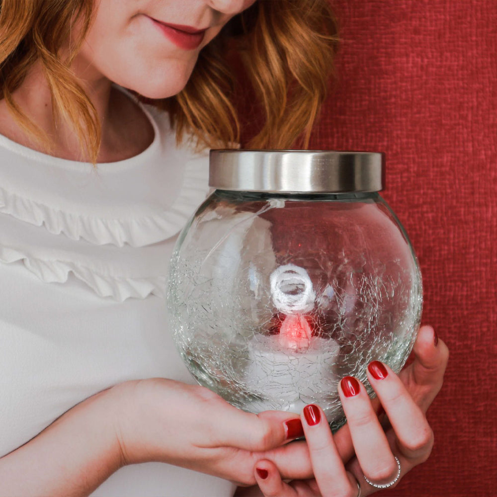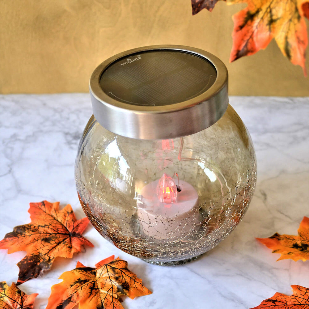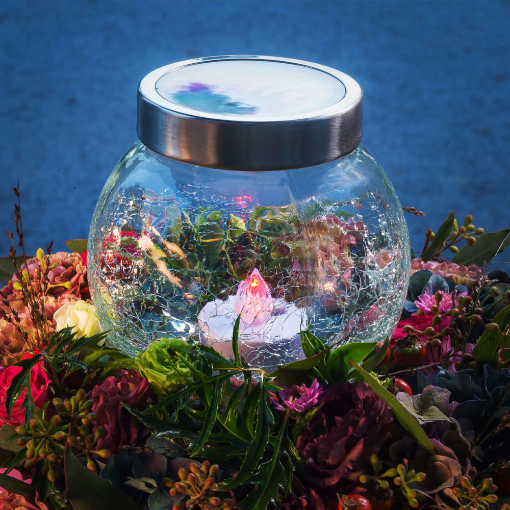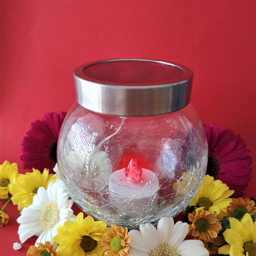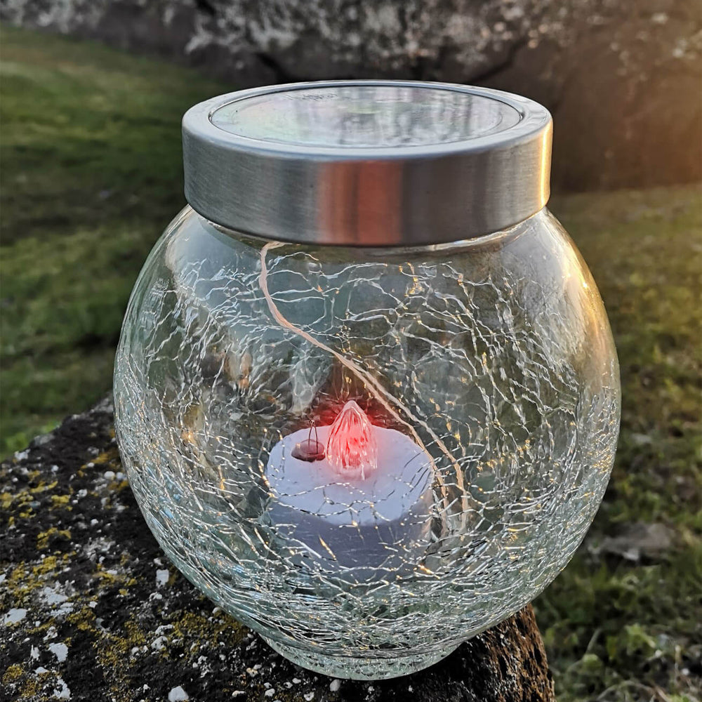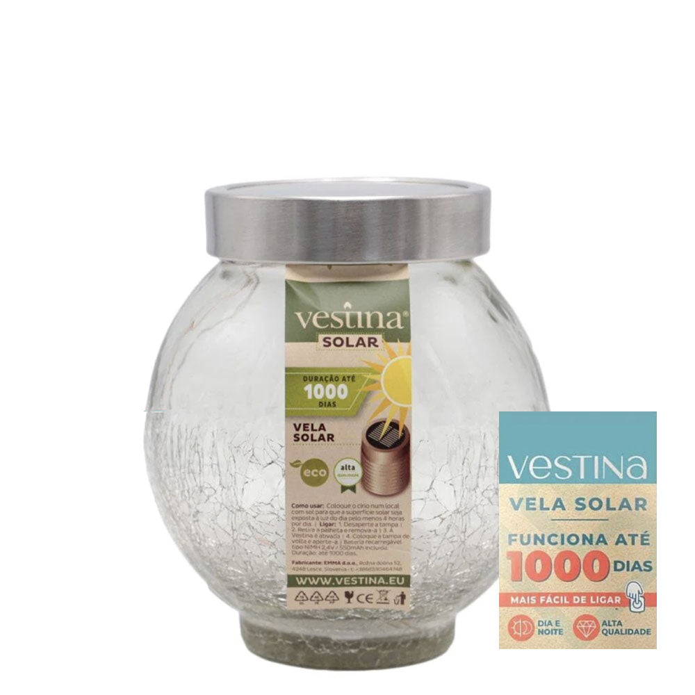 Candeeiro religioso solar de vidro com efeito estalado e tampa metálica. Ideal para colocação em cemitério (no exterior). Este candeeiro, para além de ser uma excelente opção ecológica e económica é, também, uma excelente escolha para quem não tem a possibilidade de ir regularmente ao cemitério, devido à sua prolongada duração (até 1000 dias).