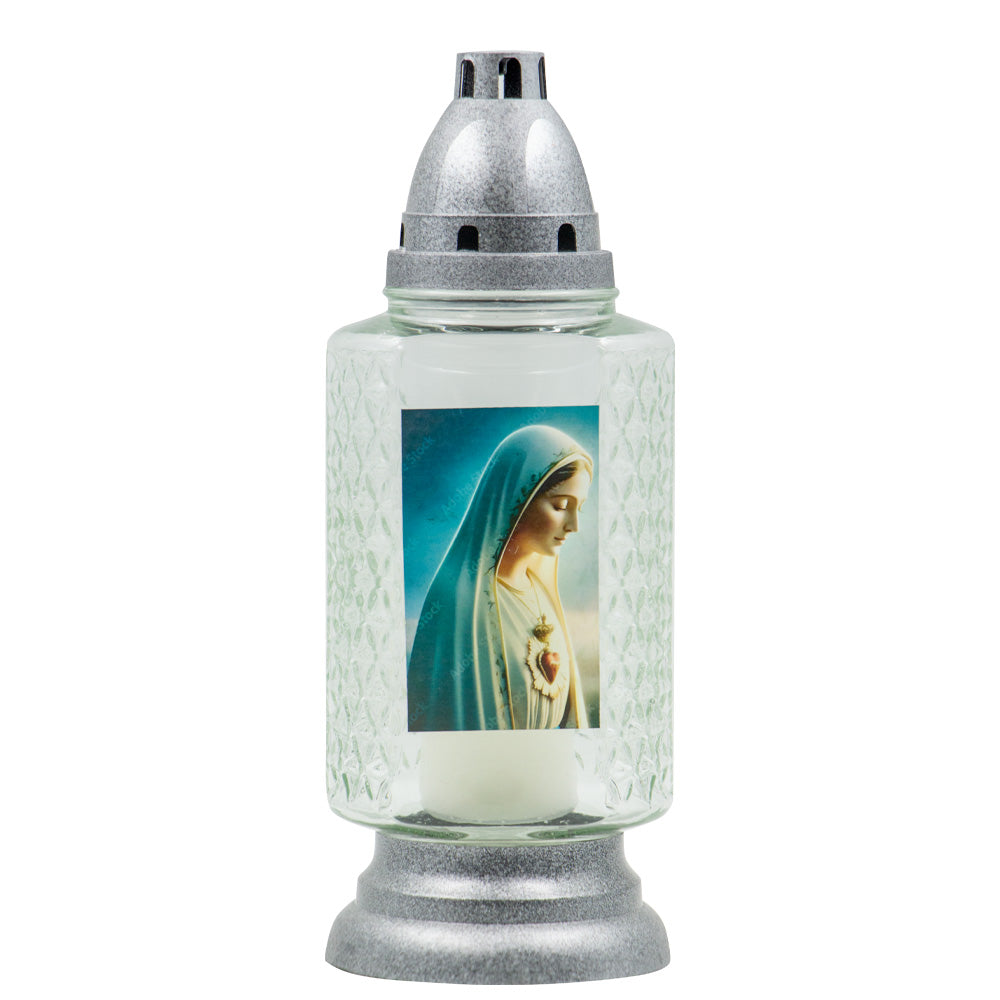 Candeeiro religioso de vidro com relevo transparente, com tampa anti-vento e base em plástico e com aplicação de imagem Coração de Maria. Ideal para colocação em cemitério (Jazigo ou Campa). Ofereça luz a quem já partiu, mantendo viva a memória no seu coração. Para iluminação do candeeiro aconselhamos a nossa recarga 0160.