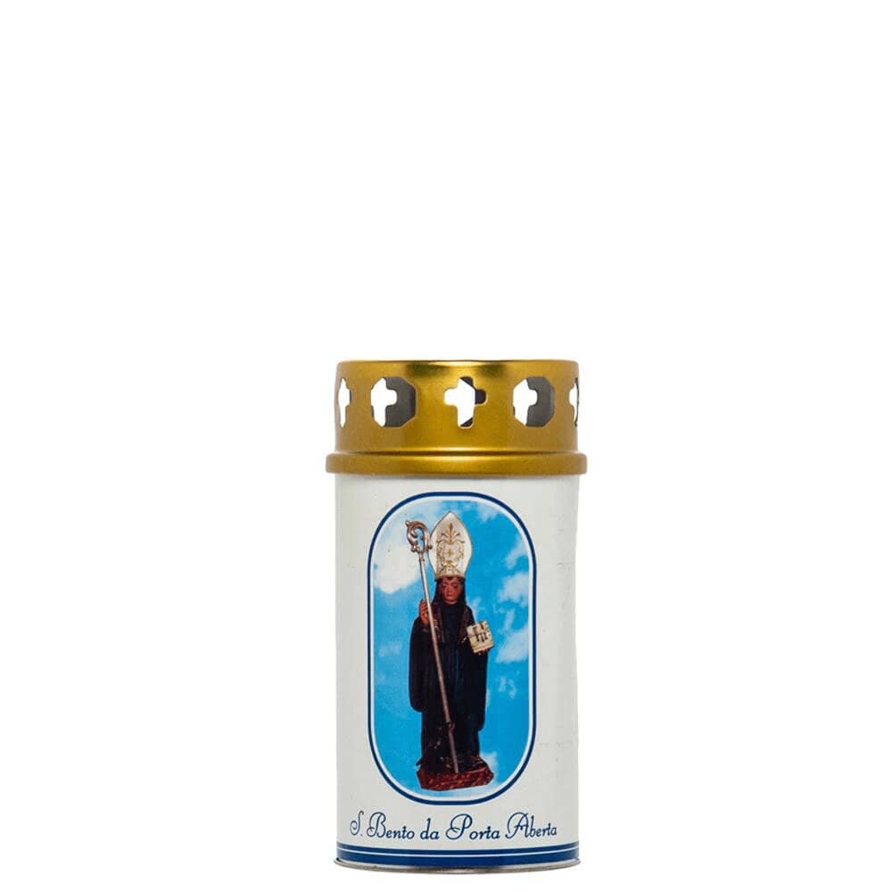 Círio Vela religiosa em copo de papiro, com imagem S. Bento, para utilização em cemitério ou cerimónia religiosa. O copo contém uma oração alusiva ao respetivo Santo. A tampa protege a vela do vento e da chuva. Círio fabricado com cera refinada de primeira qualidade.