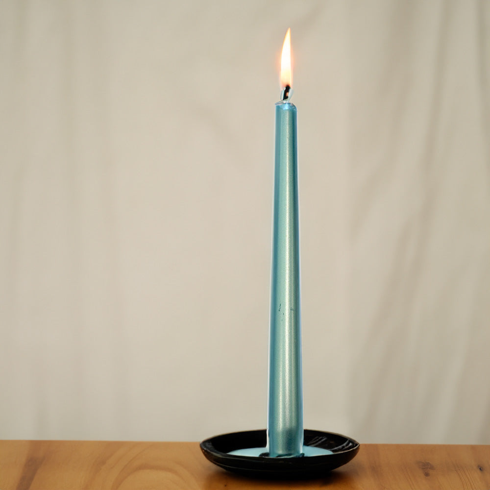 As velas cónicas em azul metálico são um elemento de decoração clássico, intemporal e imprescindível em decorações de mesas, dando um toque de requinte e elegância. Estas velas decorativas, finas e altas, estão também disponíveis noutras cores. Colocadas em castiçais de forma individual ou de forma mais dispersa, trazem brilho, aconchego e uma atmosfera intimista ao interior da sua casa. São perfeitas para uma reunião familiar, ceia de Natal ou um jantar romântico. Devido ao seu pavio, mantém uma chama uniforme, perfeita e sem fumo com uma durabilidade de cerca de 7 horas.