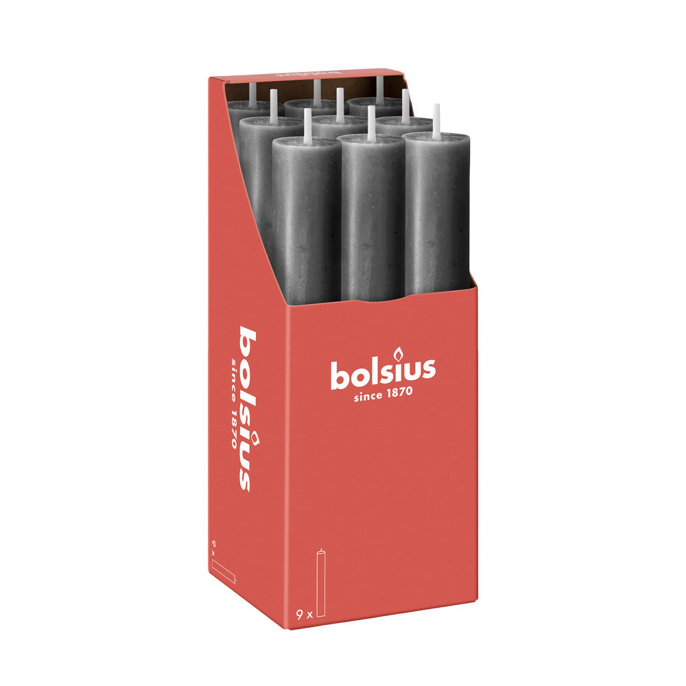 Pack. de 9 velas cónicas rústicas tamanho XL, inspiradas nas cores e texturas da natureza. Uma vela decorativa clássica e intemporal que se enquadra em qualquer interior, seja ele rústico ou urbano. Estas velas ficam maravilhosas em castiçais ou lanternas altas. Combinadas com velas de outros tamanhos e cores poderá dar um toque de requinte à sua casa. Construa um ambiente que reflita a sua personalidade. Devido ao seu pavio de algodão, mantém uma chama uniforme, perfeita e sem fumo. Feitas com base em ceras vegetais.