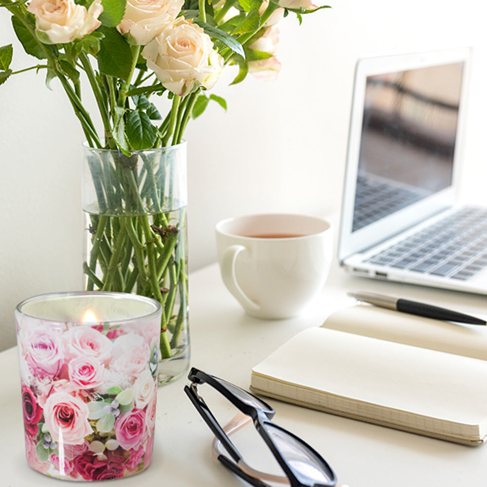 Vela aromática em copo de vidro com motivos decorativos. A combinação única de luz, sombra e uma fragância cuidadosamente selecionada, criam um ambiente perfeito para o seu lar.