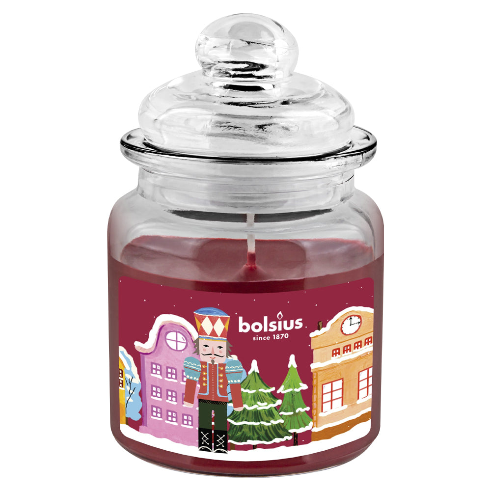 Vela aromática, cera vermelha, em copo de vidro transparente com motivo Quebra Nozes. A cada utilização poderá usar a sua tampa hermética que fará com que o aroma da sua vela permaneça por mais tempo. Velas fabricadas com cera natural e pavio de algodão que permite uma chama perfeita e sem fumo.