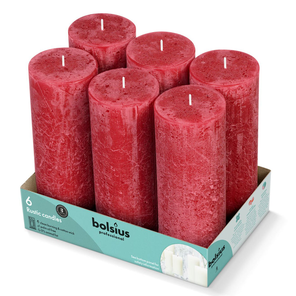 Velas Pilar Rústicas Bolsius, em vermelho veludo. Com a luminosidade das velas pode criar um ambiente de requinte e aconchegante. Na nossa linha profissional, poderá encontrar velas pilar de diferentes tamanhos para uma combinação e decoração perfeitas, ideais para eventos, casamentos e batizados. Devido ao seu pavio e à elevada qualidade da cera, estas velas mantém uma chama perfeita e sem fumo por cerca de 85h.