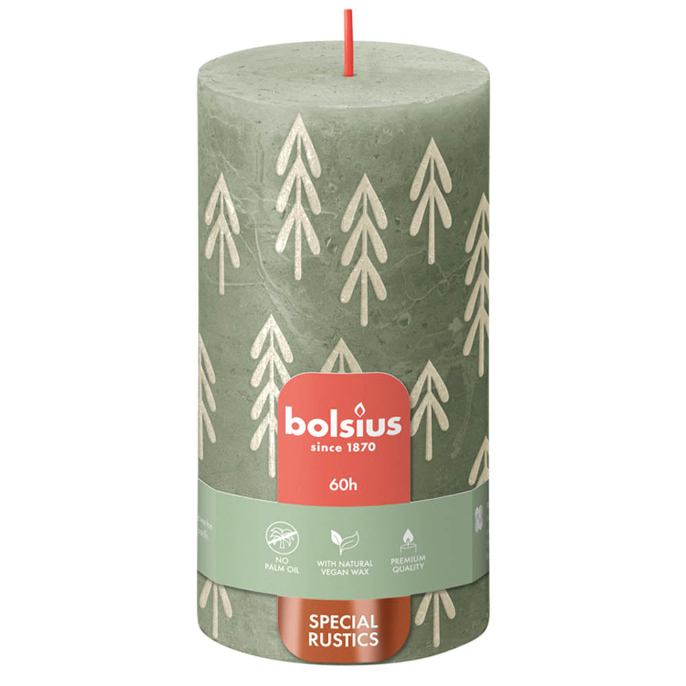 Torne cada ocasião num momento especial! Com a luminosidade das velas pode criar um ambiente de requinte e aconchegante na sua casa. Feitas com amor pelas pessoas e pelo planeta, sem óleo de palma e com extratos 100% naturais, poderá encontrar na nossa coleção Bolsius velas decorativas rústicas de diferentes tamanhos e em várias cores. Devido ao seu pavio em algodão, mantém uma chama perfeita e sem fumo por cerca de 60 horas. A vela pilar rústica em verde seco com motivos, com acabamento mate, inspirada na natureza, traz brilho à sua casa e enquadra-se em qualquer decoração.